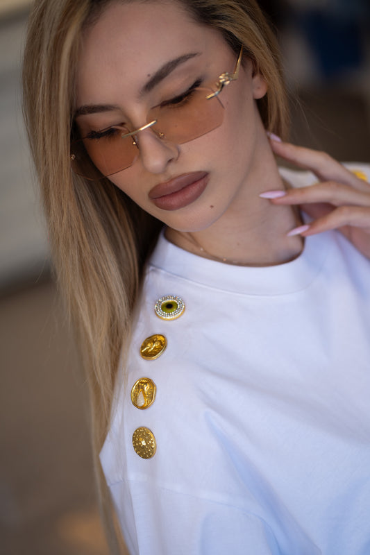Бяла тениска със златни копчета